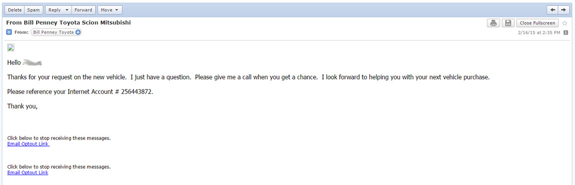 I have since received five more emails from Bill Penney Toyota: